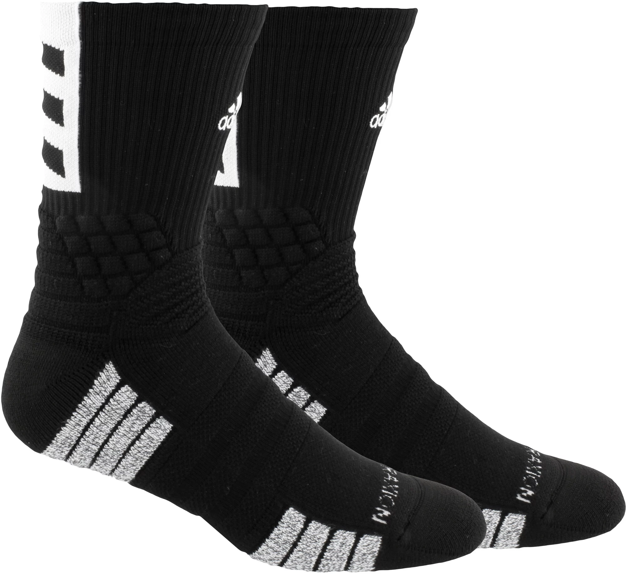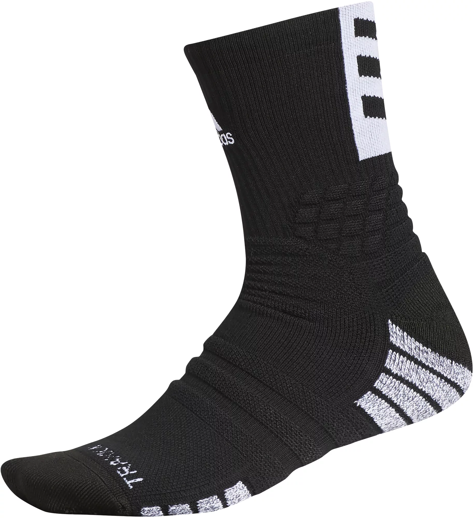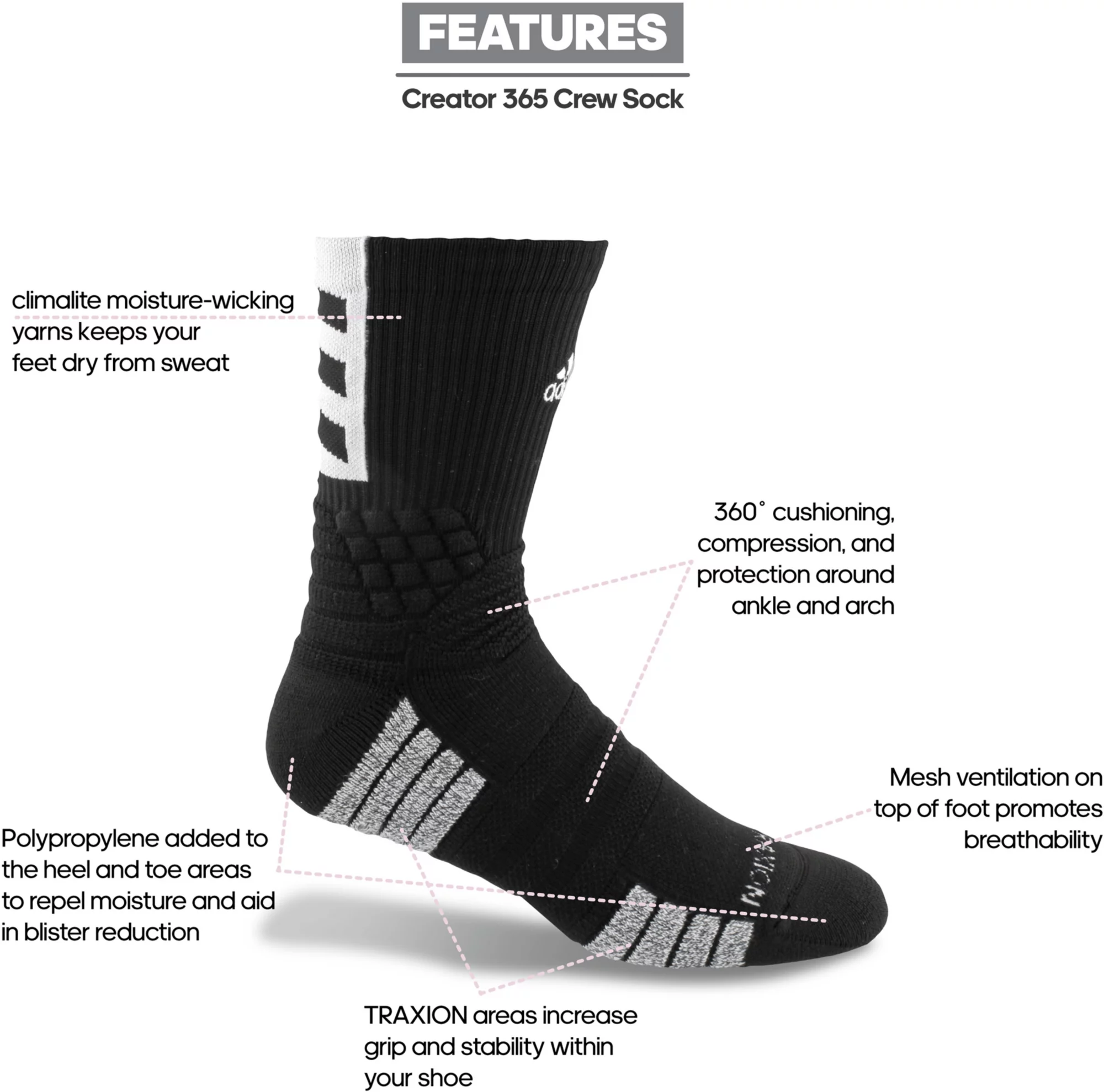 Step on to the court with confidence in the adidas® Creator 365 Crew Socks. They feature 360-degrees of ankle cushioning for comfort and protection with moisture wicking yarn to keep your feet dry. With a traxion footbed to offer a stay-put fit, and polypropylene in the heel and toe repel moisture to help prevent blisters.