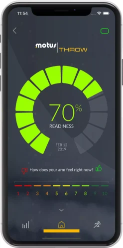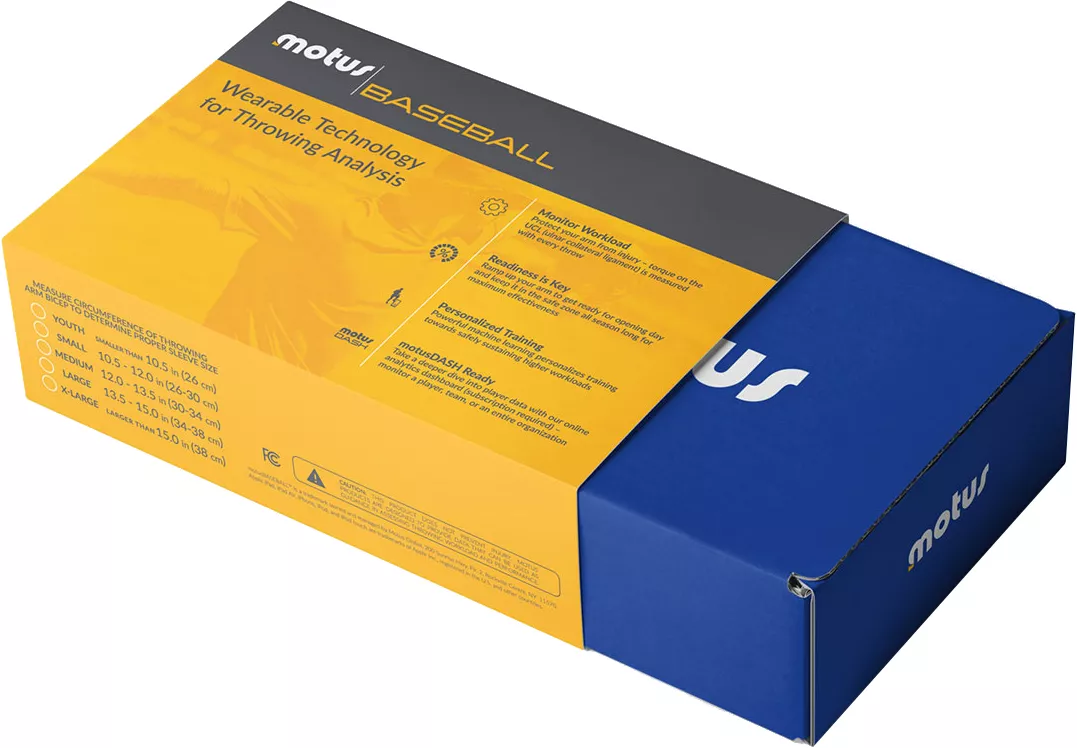 Monitor your youth athlete’s training with the motusBASEBALL™ Complete Training Package, which features a lightweight compression sleeve and motus™ sensor that syncs with your iOS device to develop a customized training program for pitchers and batters.